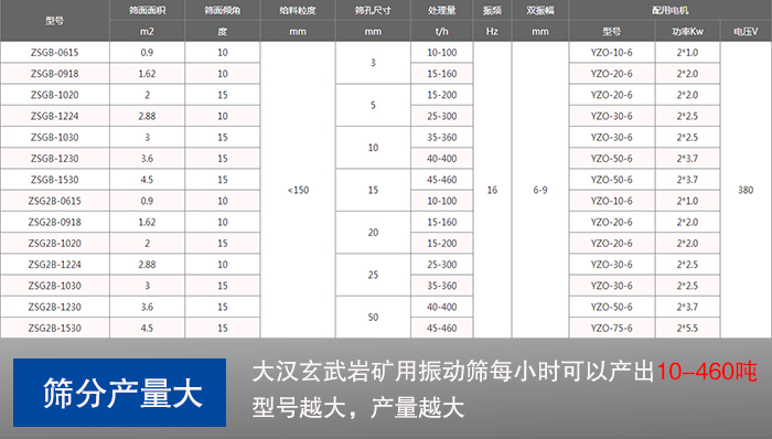 針對玄武巖篩分而言,篩分產量往往是放在一位的,大漢玄武巖礦用振動篩每小時可以產出10-460噸的玄武巖成品,設備型號齊全,不同產量選擇的礦用振動篩型號不同,產量越大,選擇的礦用振動篩型號自然也是越大的。